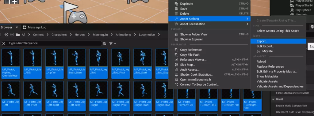 All you need to do is select all of the animations in the folder (you can filter by ‘Type=AnimSequence’), right-click, and in the asset actions sub-menu select “Export”.